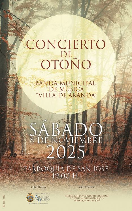 El Ayuntamiento de Aranda de Duero, a través de la Concejalía de Educación, organiza el tradicional Concierto de Otoño de la Banda Municipal de Música “Villa de Aranda”, que tendrá lugar el próximo sábado 8 de noviembre a las 19:00 horas en la Parroquia de San José. El evento cuenta con la colaboración de la Asociación de Vecinos del Polígono Residencial ‘Allendeduero’ y la propia Parroquia de San José, y se enmarca en el compromiso municipal con la promoción de la cultura y la música en directo.